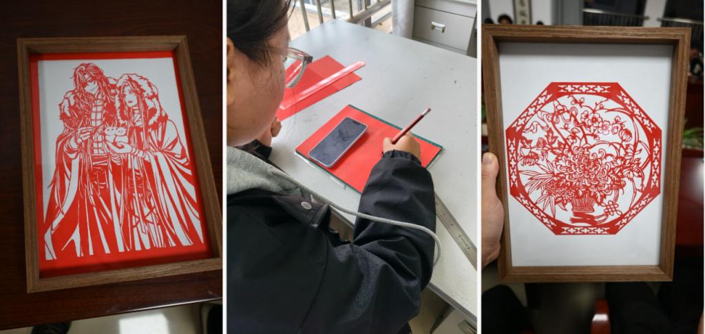纸间乾坤,刀下生花,一幅幅生动的剪纸图案在指尖跳跃,活灵活现,同学们创作的剪纸作品不仅保留了非遗剪纸的精美细腻,还巧妙地融入了自己的风格和情感元素。看到自己的剪纸图案在画框里熠熠生辉,金日平同学非常感叹,“这是根据我喜欢的动漫形象设计出来的剪纸图案,想不到非遗也可以这么酷!”