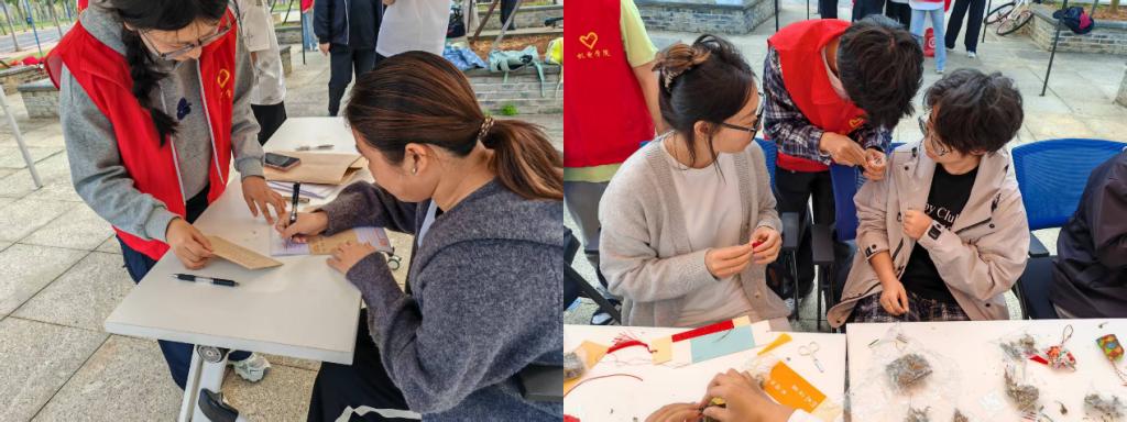 手作体验区欢声笑语一片,同学们亲手裁剪布料、搭配香料,缝制寓意安康的重阳香囊;或是拿起画笔,在风铃与书签上勾勒祈福纹样,将美好期许凝结于指尖。穿针引线间、笔墨挥洒中,传统民俗的韵味悄然流淌,在动手实践中感受传统手工艺的温度与魅力。