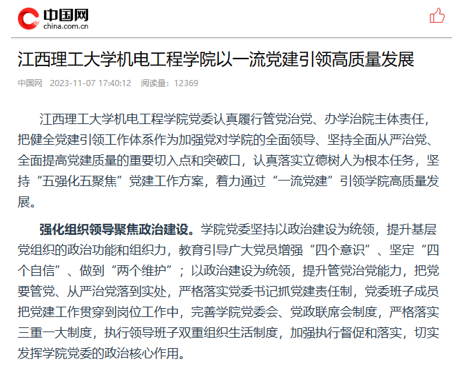 强化思想政治教育聚焦立德树人。学院党委深入开展思想引领教育与价值引领系列活动,加强学院思想政治工作的组织领导与保证工作,将思想政治工作纳入学院党委重要议事日程,深化“三联系”制度,全面推行毕业生德育答辩,完善学生德育档案;构建师德师风教育、创新创业教育、党风廉政教育、新媒体应用、中国传统文化教育相结合的思想政治工作机制,深入推进红色文化进思政工作,积极推进“课程思政”的申报与教学;强化思想政治与学术文化的融合,开设机电论坛、双创讲坛等,提升大学生对专业的文化认同;强化思想政治与红色文化的融合,开展重走长征路、红色走读等活动,突出诚信、法治和社会责任感的培养;强化思想政治与行业特色文化的融合,将“客家人 红土魂 矿冶情”植入教学科研活动中,提升大学生对地域行业文化的情感认同。